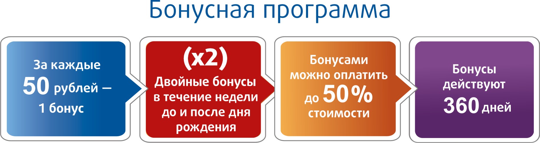 • Действует единый тариф для всех клиентов. За каждые 50 потраченных рублей начисляется 1 бонус. 1 бонус = 1 рублю.