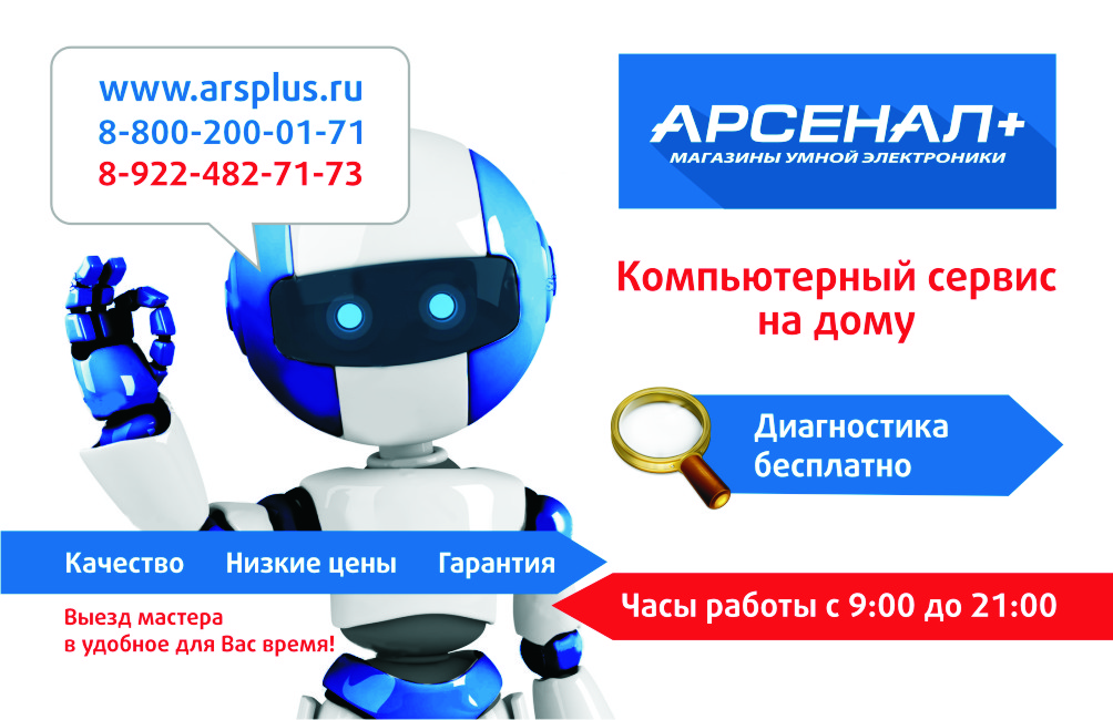 Теперь в любом магазине Арсенал + г.Тюмени можно заказать услугу выезда на дом компьютерного техника, который настроит ПК, роутер, принтер и т.д., соберет новый или модернизирует имеющийся компьютер из ваших деталей, а также повесит телевизор на стену, подключит и настроит - Fi , соберет мебель, которая продается в интернет магазине Арсенал + - это компьютерные столы и стулья и многое, многое другое.