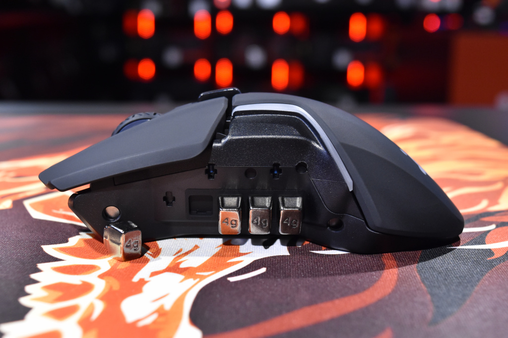 Одной из интересных особенностей Rival 650, кроме своей конструкции двойного сенсора, является инновационная система регулировки веса. Чем же она так хороша? Для того, чтобы ответить на данный вопрос стоит буквально на секунду углубиться в историю. Как правило, раньше регулировка веса в мышках была условная. То есть игрок обычно помещал специальные грузики внутрь мышки, где для них были предусмотрены специальное место, которое как правило находилось на дне устройства. Но в Rival 650, SteelSeries решили пойти дальше. Вместо привычной схемы, геймер теперь сам выбирает и равномерно распределяет вес мышки с помощью грузиков. В Rival 650 предусмотрено четыре отдельных слота с каждой стороны девайса (!), которые позволяют установить до восьми грузиков весом 4 грамма. Проблема распределения веса внутри мышки, по сути, решена вот таким вот простым, но очень эффективным решением, которое должно удовлетворить любого, кто хочет идеально настроить свою мышку под себя.